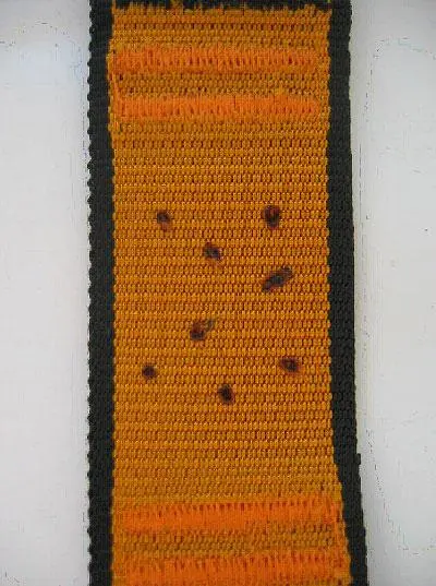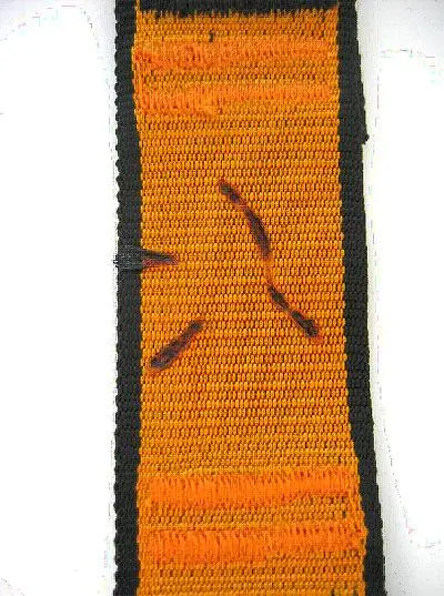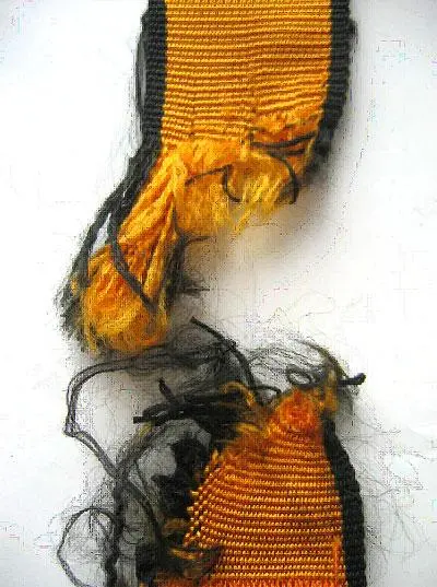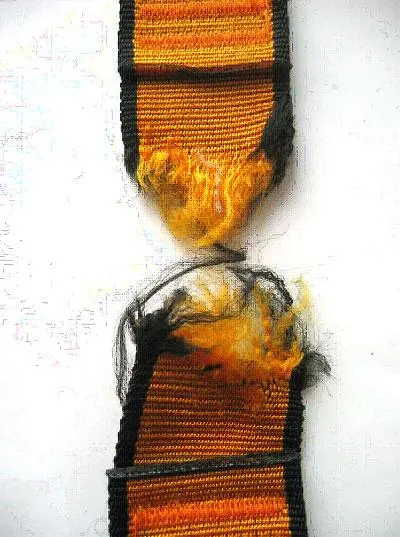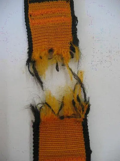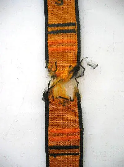 Surface damage to the yarn at a number of spots, about 90% of the yarn, with part of thermal damage reaching the edge of the sling