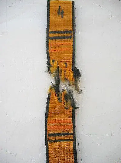 In case of the 10 “year-old” slings, we did not come to the study’s objective since all the five samples of various damage levels burst at the point of the new strength sewing, which made it impossible to monitor the relation between the solidity of an old sling and the level of damage.