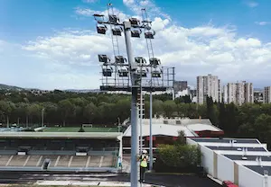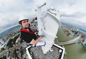The MastLadder is a unique design with integrated rungs. It is entirely composed of high-grade aluminum for pylons, confined spaces, and industrial halls. Undeformable stainless steel brackets connect the ladders to the structure.